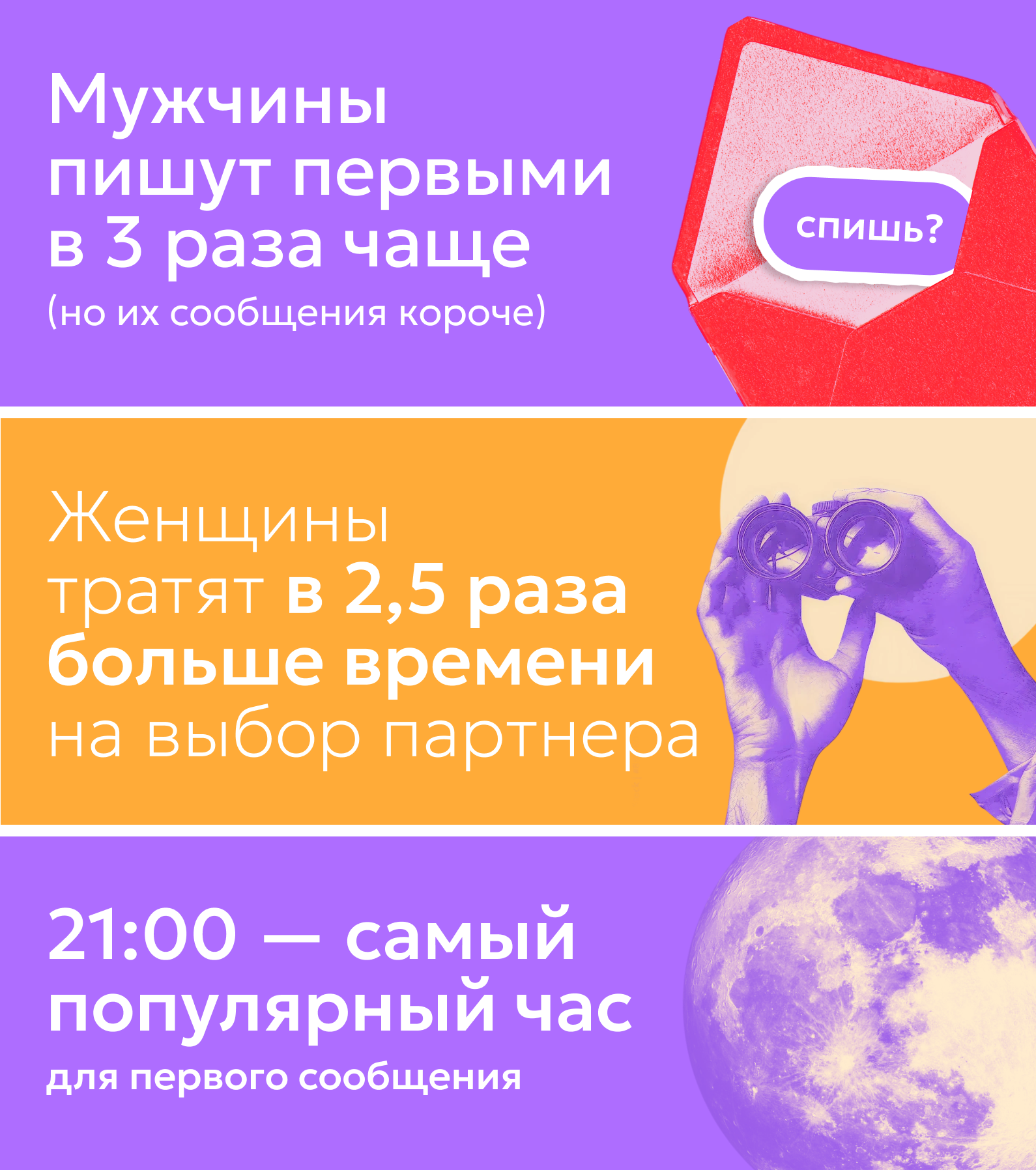 Статистически, мужчины отправляют в 3 раза больше первых сообщений, чем женщины. Но символов в них, обычно, меньше. Например, мужчина напишет «Привет, как дела?» , а женщина «Привет! Вижу, ты любишь Мону — я тоже ходила на ее концерт в прошлом году».